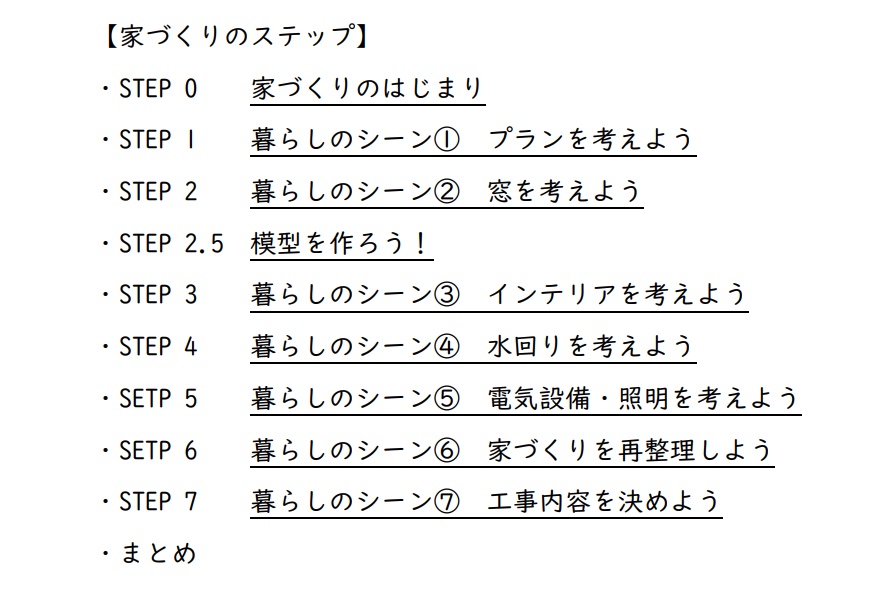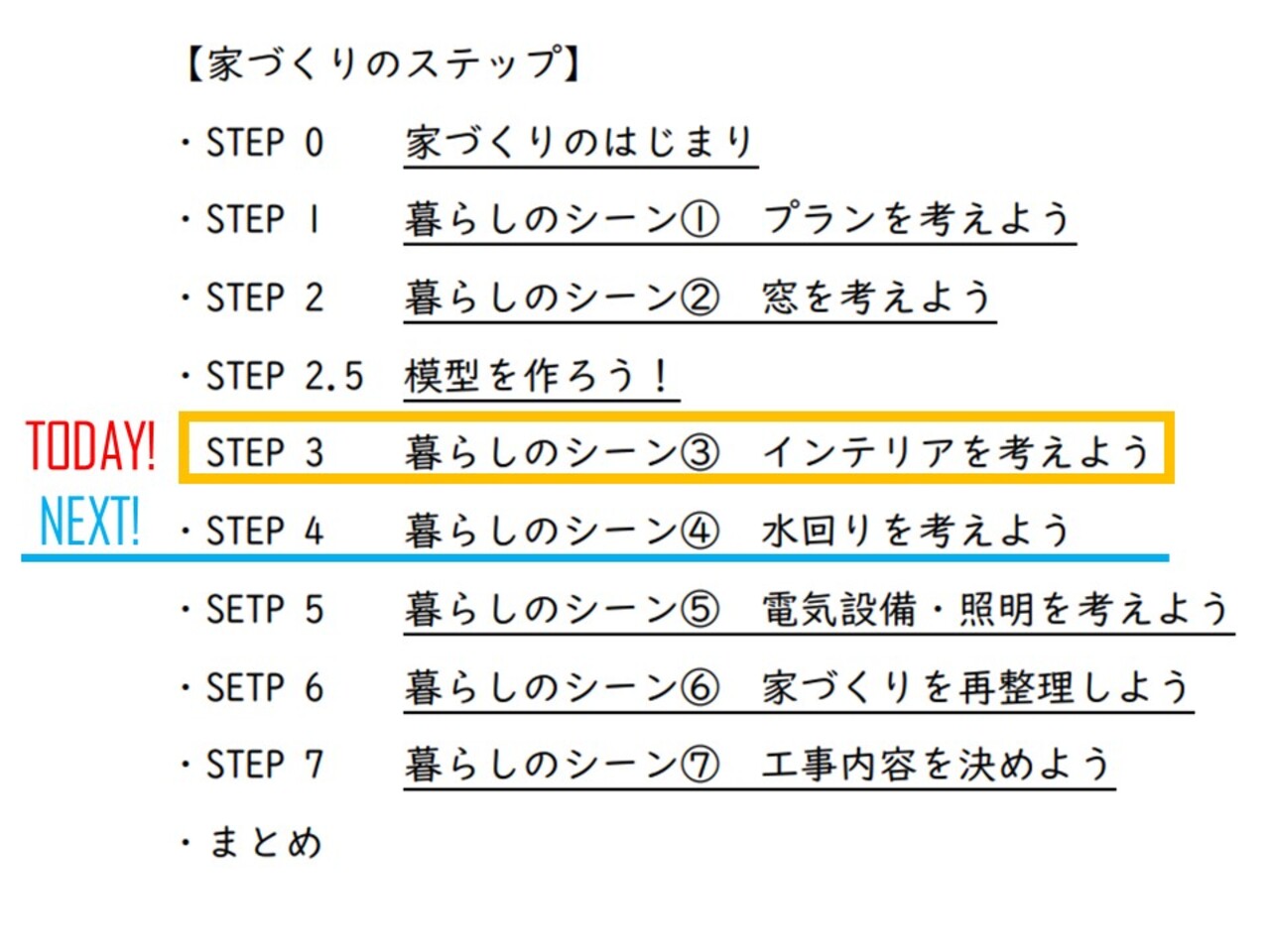 次回はSTEP6『家づくりを再整理しよう』ということで、これまでに決めたことを再度検討するフェーズ。