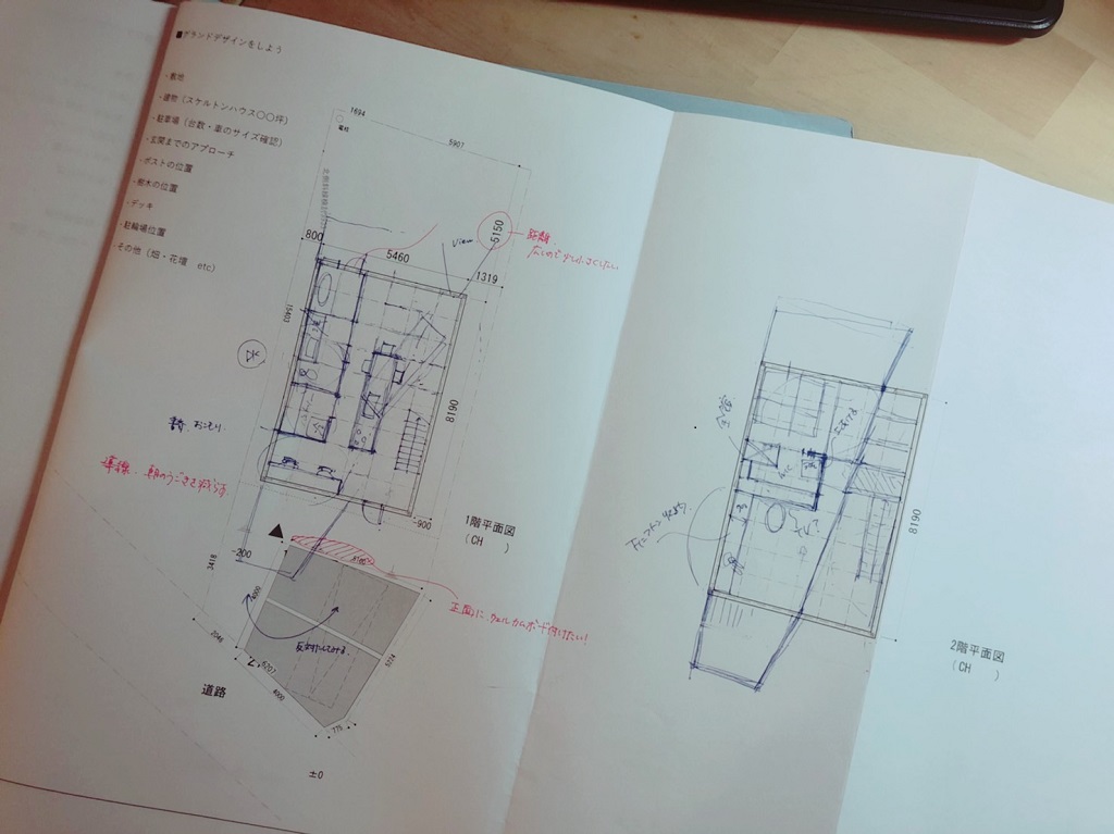 初回は「STEP1:間取りの打ち合わせ」に入る前の、「どういう家を作りたいか会議」です。なので私達は「STEP0」と呼んでいます。家のテーマとコンセプト、生活の仕方をおさらいします。そして敷地図をみんなで見ながら、お庭をどうしたいか、どんな生活動線が良いかなど、間取りになる前のフワフワとしたイメージを書き込んでいきます。