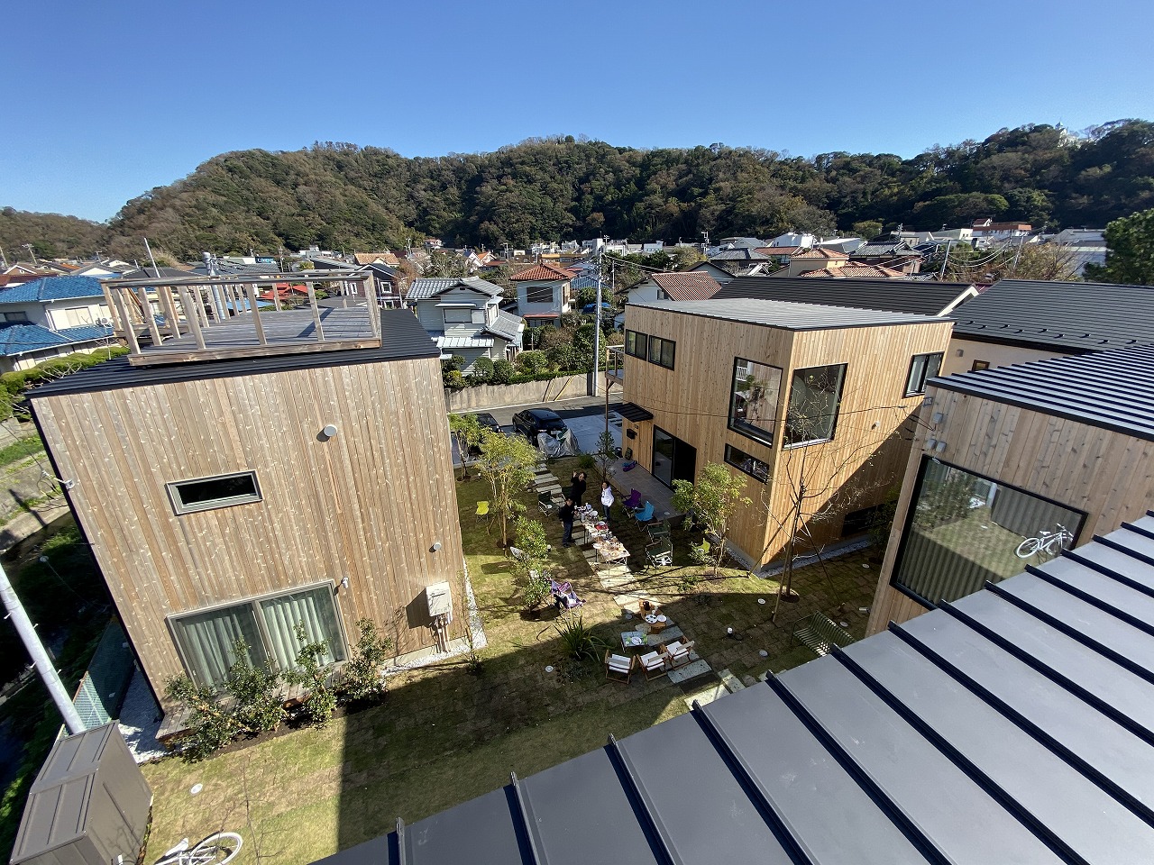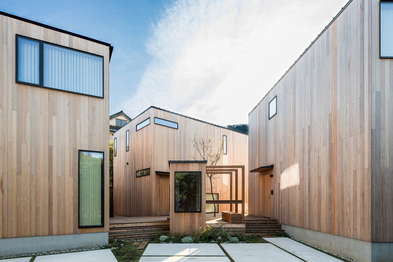大きな敷地を分割して売買する。この点は他の不動産屋さんと同じですが、この敷地の割り方、建てる建物、配棟、外構計画など、その敷地を小さな街としてエンジョイワークスが設計し、マスタープランを描いています。そこには境界の塀はなく、植栽が緩やかにお互いの家の視線を緩和し、そして窓からの借景を生み出します。