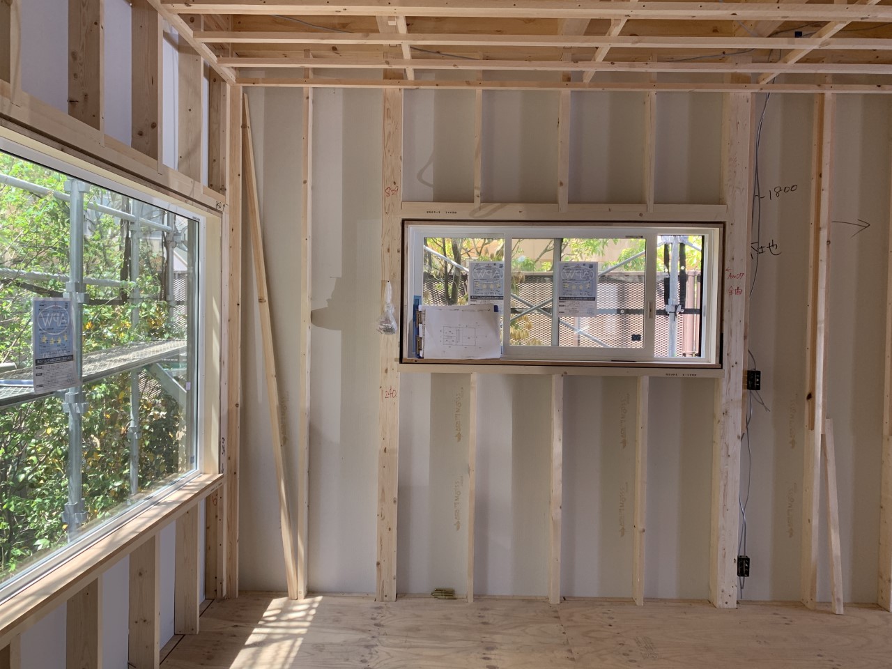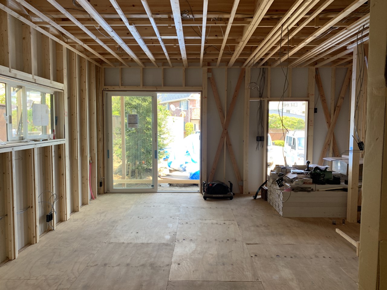 最終的には、テラス窓の先にはカバードポーチのデッキができ、さらにその先にはB区画のスケルトンハウスが見えます。
