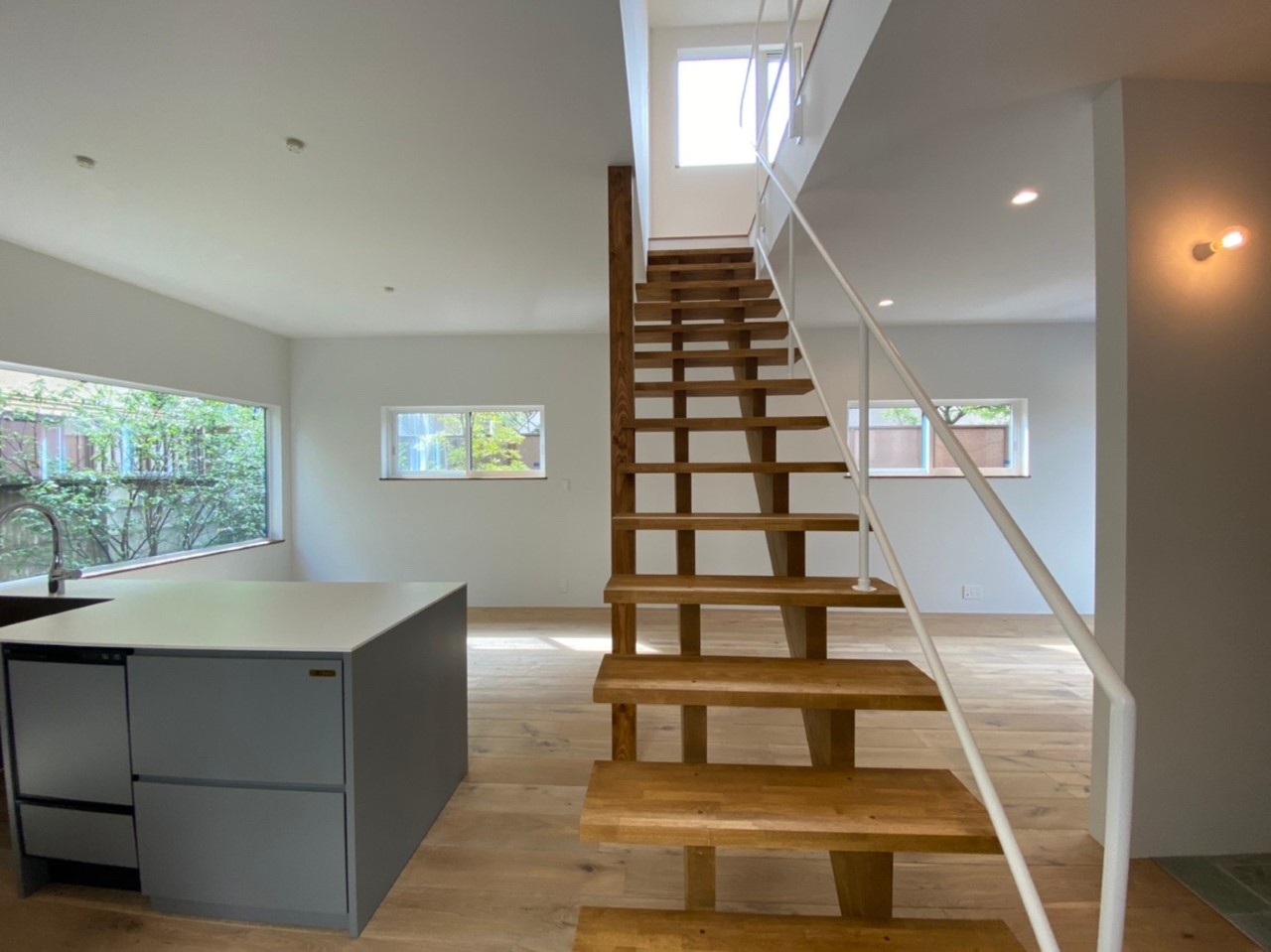 1階のキッチンからの眺めは、緑がパノラマで感じられます。