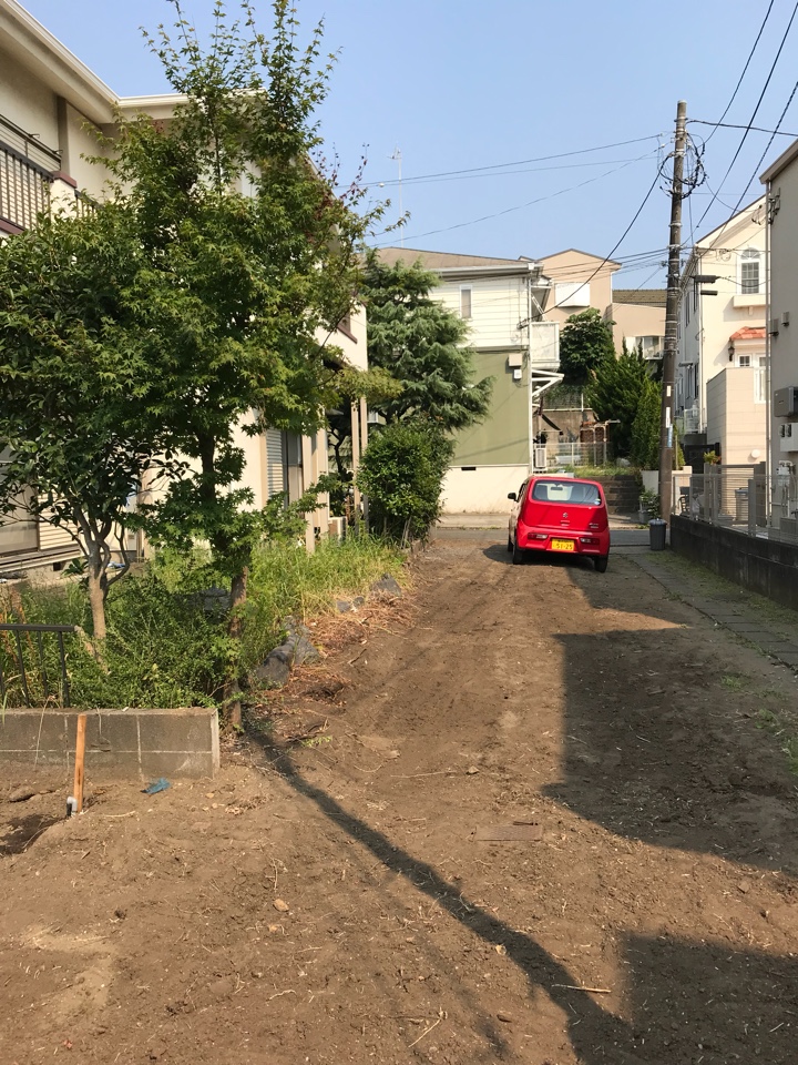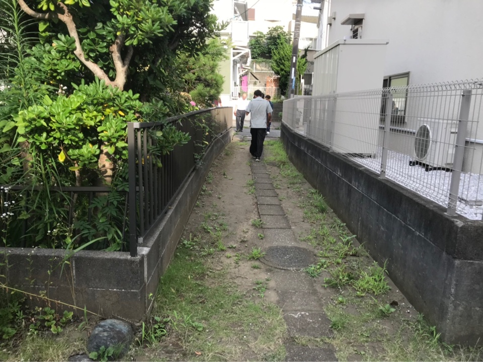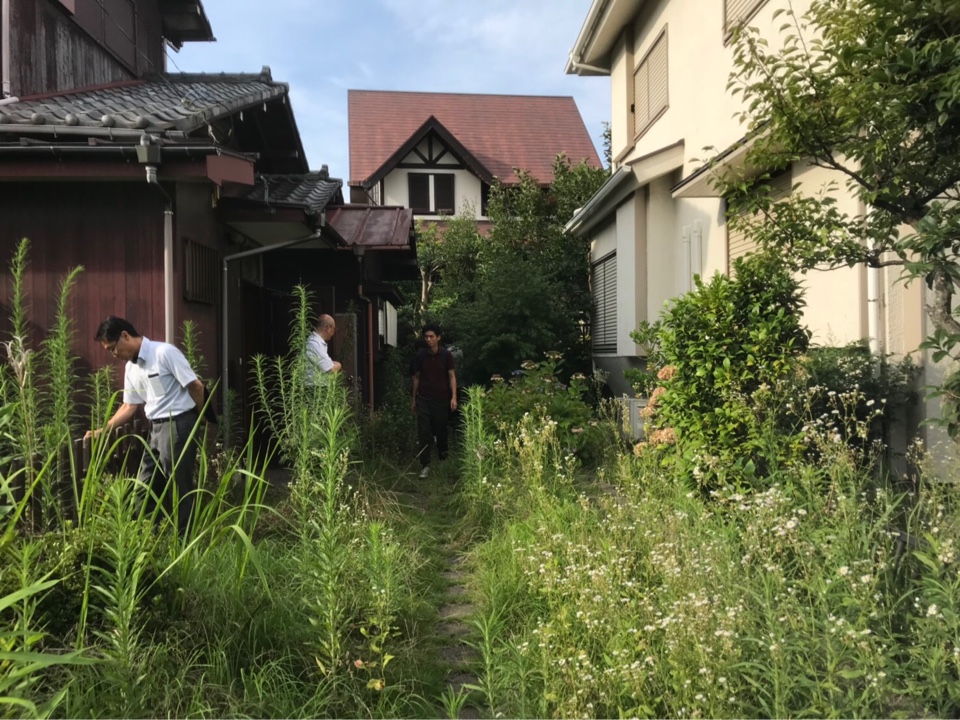夏の時期だったため雑草が伸び放題。この時点ですと敷地全体の雰囲気はよくわからない状態でした。前面道路からの通路も細かったため、お隣の方と共有で使用する通路でもあるためアプローチを広げる工事も行いました。