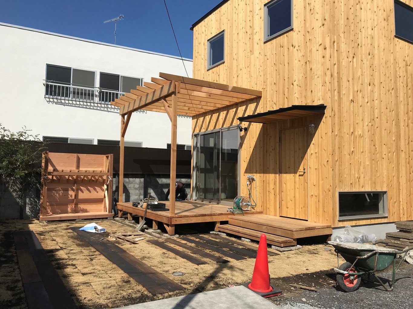 いよいよ工事も終盤に入り、足場も外され、木張りのスケルトンハウスが見えてきました。工事後半は建物だけでなく外構工事もスタートしました。