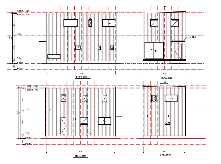間取りを考える上で重要なサッシの位置もまとまり、立面図も完成しました。