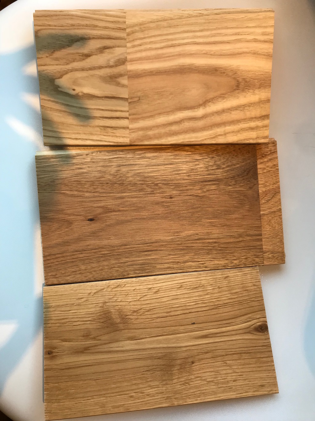 この3種類の中ではオークが一番硬く、今回選んだ床材は硬すぎず、柔らかすぎないクリの無垢材を選びました。色合いや質感のバランスが丁度良いところが特徴です。