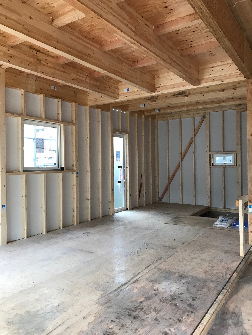配筋検査も無事クリアし、気づけばあっという間に上棟し、耐力面材のモイスが張られ、建物の全体ボリュームがみえてきました。