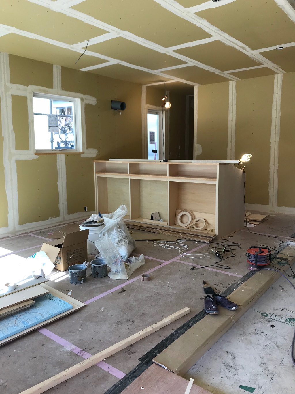 断熱材を入れた後、石膏ボードを張り、キッチン廻りの造作家具の箱組みが出来上がりました。