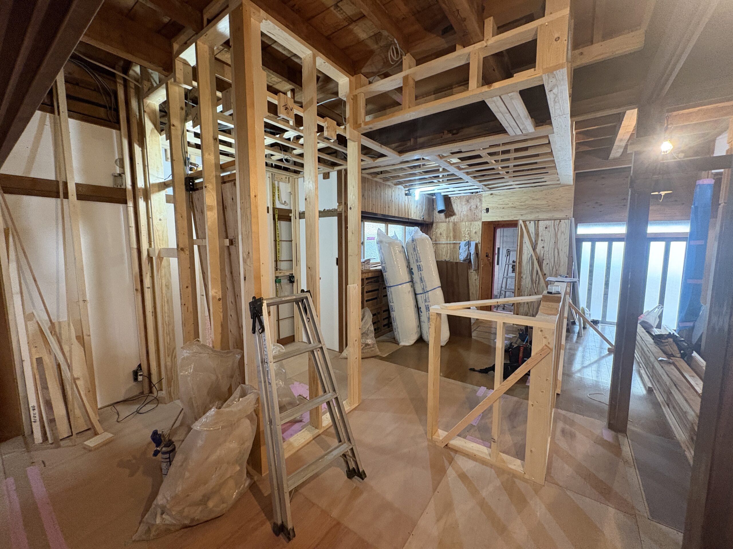 そこで今回のリノベーションでは、見た目の雰囲気を損なわないよう配慮しながら、できる範囲で断熱性能をしっかりと向上させています。天井裏にグラスウールを敷き詰め、壁の一部にもピンク色の部材も断熱材を入れています。完成後には見えなくなる部分ですが、心地よさを支える大切な工事のひとつです。
