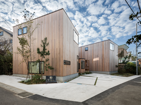 スケルトンハウス」を採用し、シンプルな箱形、外壁の木材、窓のデザインと外観としての統一感を図るとともに、2階建てのボリュームや隣棟間隔により、地域にも馴染む、落ち着いたまちなみの一部になっています。