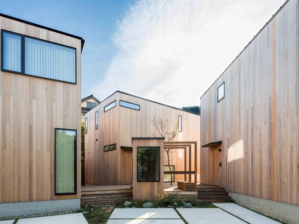 The Canvas Hayama Park」は、「この地に暮らすように滞在する」ことをコンセプトとし、木の外観の3つの一戸建てがシンボルツリーと小屋を含む共用デッキでゆるやかに結ばれた施設です。