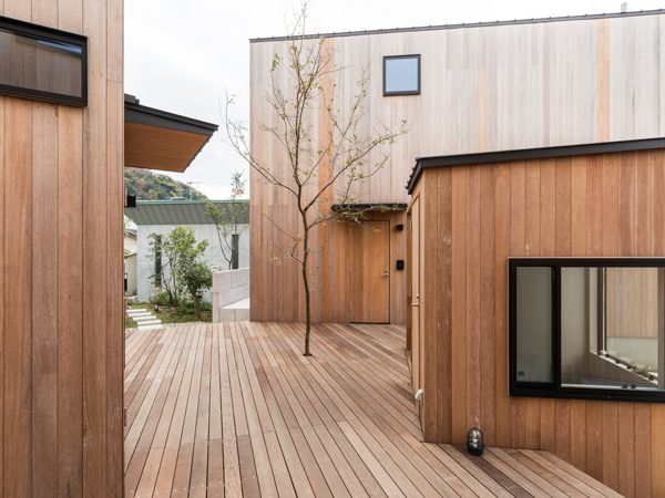 「The Canvas Hayama Park」においても、各棟をヴィレッジの考え方で計画しており、とくに中央部のデッキスペースは、全体の一体感をつくり出すだけでなく、葉山の周辺にも半ば開くかたちで、セミパブリックな場をも形成しています。