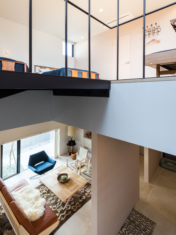 こちらはリビングゾーン。吹き抜けの空間に吊るされた照明は、横須賀にアトリエ「