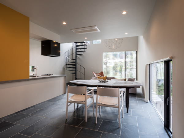 そこへ程よくアクセントとなって明るい気分を与えているのがキッチンの壁に使われている少しくすんだイエローです。そして、山側に設けられた大きな吹き抜けからは部屋全体に光が行き届きます。
