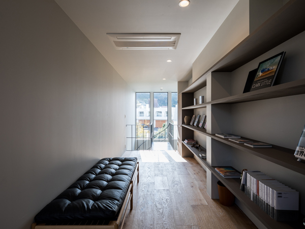 通路に面した棚には、世界各国の建物や自然にまつわる写真集が収められており、革張りのデイベッドでくつろぎながらページをめくるのも豊かなひと時。正面の開口部からはたっぷりとした自然光と葉山の緑が感じられます。