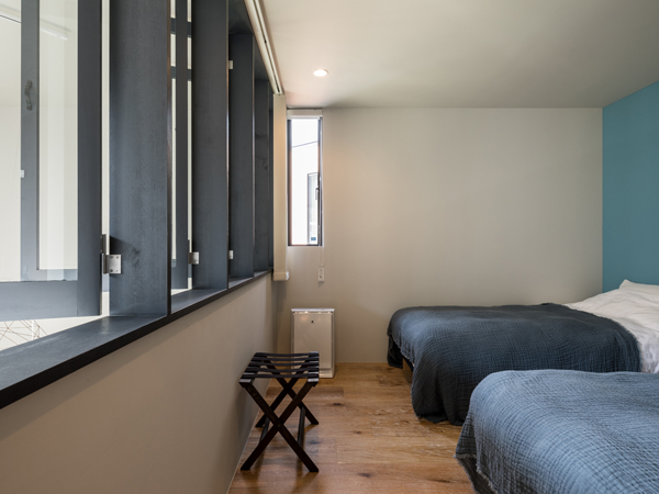 吹き抜けに面しているこちらのベッドルームには内窓を設置し、光や開放感を取り入れたつくりとしました。
