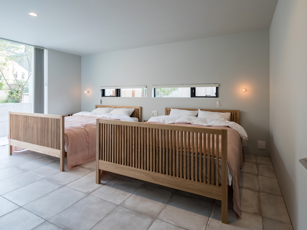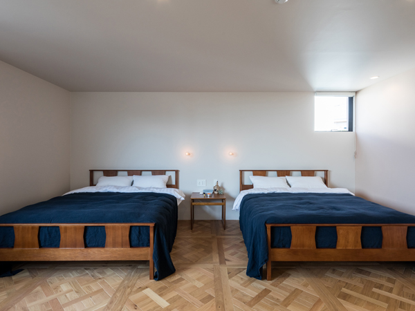 こちらは1階にあるベッドルーム。ダブルベッドを2つ連ねてもなおゆとりのある空間は温もり感のあるグレーを基調とし、ベッドフレームの木部やデュベカバーのくすんだピンクが、大きな開口部から見える山の緑とともに優しい彩りをもたらしています。
