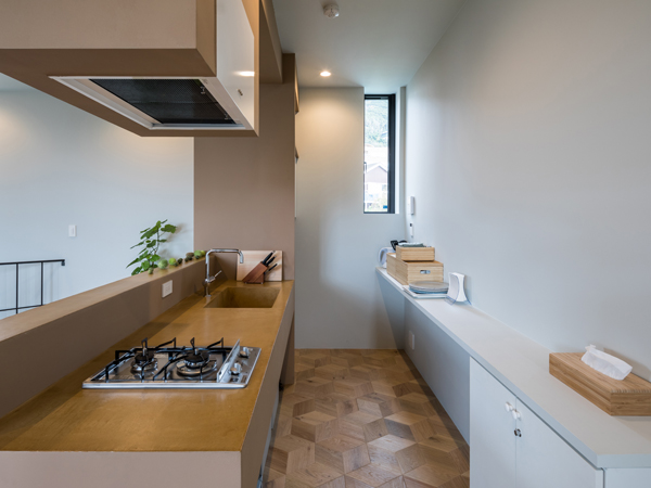 キッチンはシンクまで一続きにモールテックスで仕上げています。