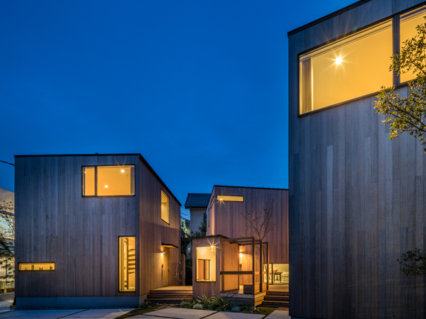 「ヴィレッジ」とはエンジョイワークスが提案する複数棟が集まってつくる住まい方のスタイルです。プライバシーを確保しつつも各棟の間には塀等は設けず、土地への建物配置や窓の開け方、また外構・植栽計画をうまく利用してゆるやかに仕切り、通風、採光、風景等をシェアしながら互いに心地良い住環境を得ることができます。