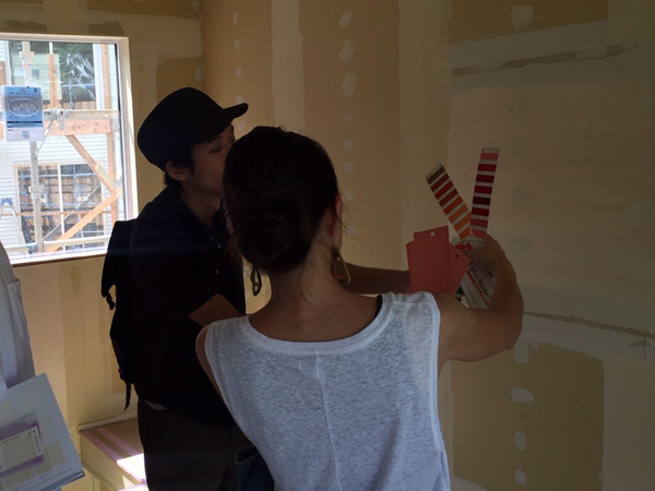 現地の光の中で一緒にカラーカードを見ながら、壁の色を決めています。