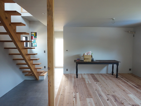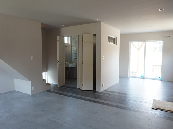玄関ドアを開けると、1階は一面の土間。「洋」がテーマとあって、外履きのまま過ごせそうな空間です。モールテックスの仕上げですが、センター部分だけ色を変えています。モールテックスはペンキではなく左官材なので、普通のモルタルに比べれば薄いとはいえ、厚みがあります。なので、色を変える際にはその境目に型枠を設置して塗布していくそうです。段差も歪みもなく滑らかに仕上っているのは、ひとえに職人さんの腕!