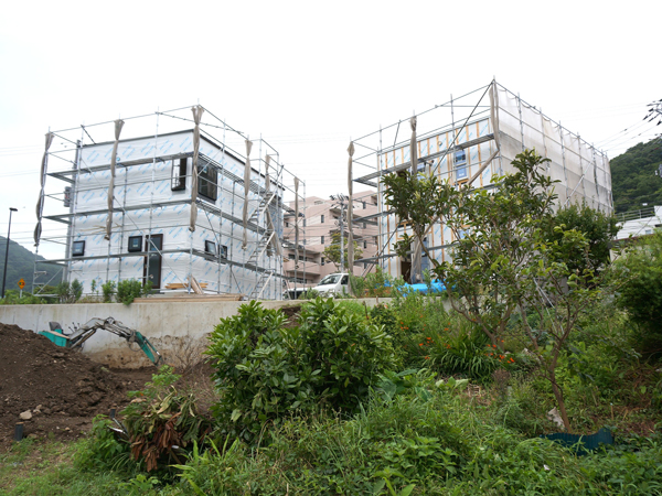 ちょうど道路側の敷地には、2棟のスケルトンハウスが上棟を迎えています。