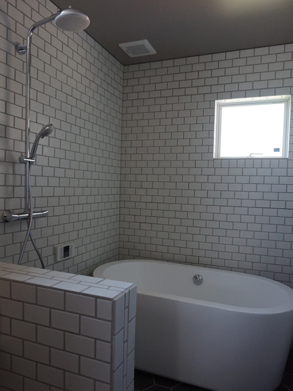 壁には白いタイルをグレイの目地で。目地の色をグレイにすると、グッと大人っぽくシックに仕上がります。気持ちいいレインシャワーも設置。