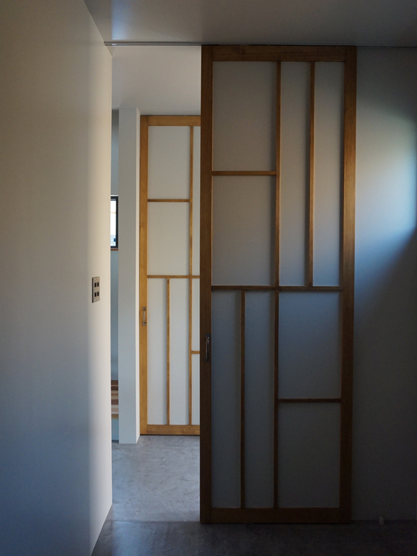 藤沢の「キヤ・アンティークス」で見つけた4枚の折戸を使って、一方は浴室へ、一方はトイレへと続くドアに仕立てました。