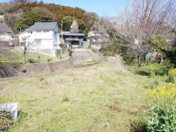 さらに川の近くに降りていくと、ヴィレッジ建設地の一段低くなった河岸部には、これまた広い土地が広がっています。隣地の木や川向こうの山々の背景ものどかでいい感じ。長柄ヴィレッジは、道路沿いの土地に2棟、そしてこの川沿いの土地に1棟の家を建てる計画ですが、実はこの川沿いの土地は、長柄ヴィレッジの計画が本格化する前からMさんというご家族が大変気に入り、「それであれば」ということで今回Mさん一家との共同購入という形で、我々はこのヴィレッジ候補地を決めたのでした。