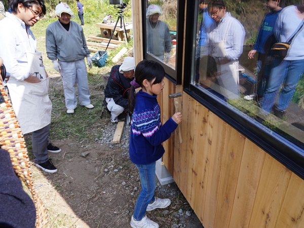 後の仕上げでは、小屋作りを楽しみに訪れた子ども達の手も借りて、なんとか1日で無事に完成しました。