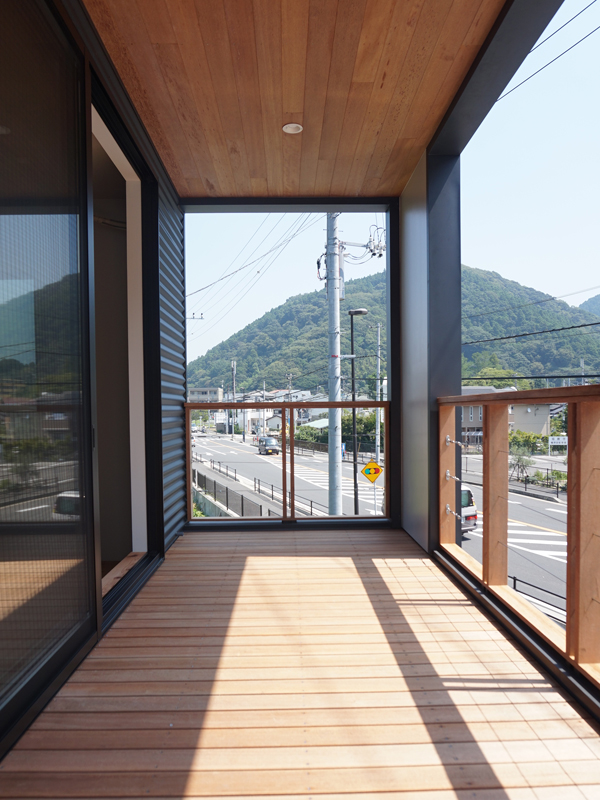 山の眺めや吹く風、あたりの植物の匂い、季節の空気…そんな自然の気配をダイレクトに感じつつも、守られているような安心感のあるバルコニー。リビングの延長として、家族のお気に入りの場所になりそうです。