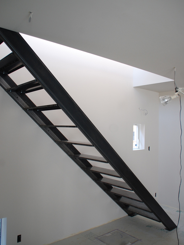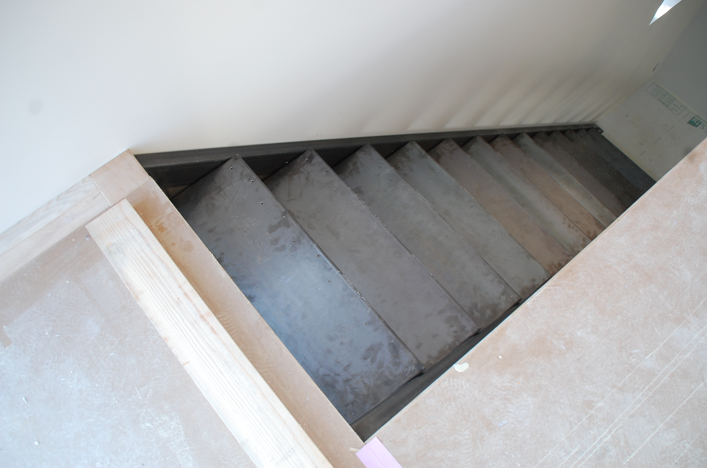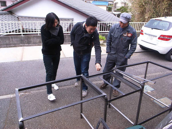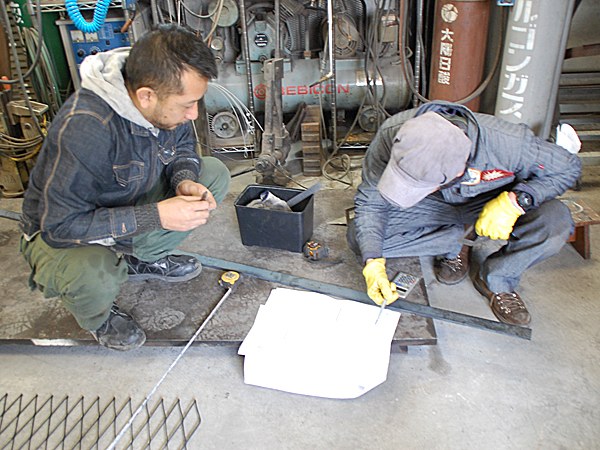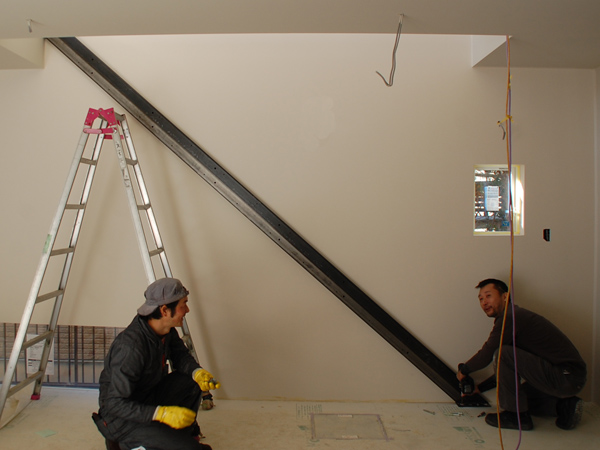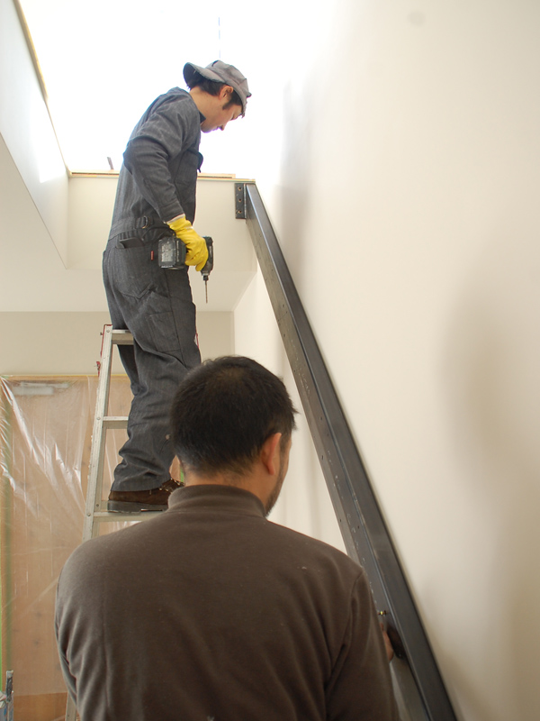 先日、葉山の橋本大輔さんの工房にて制作した鉄のフェンスが、階段の上に取り付けられようとしています。歪みが生じないように差し金を当てつつ、床面に固定していきます。
