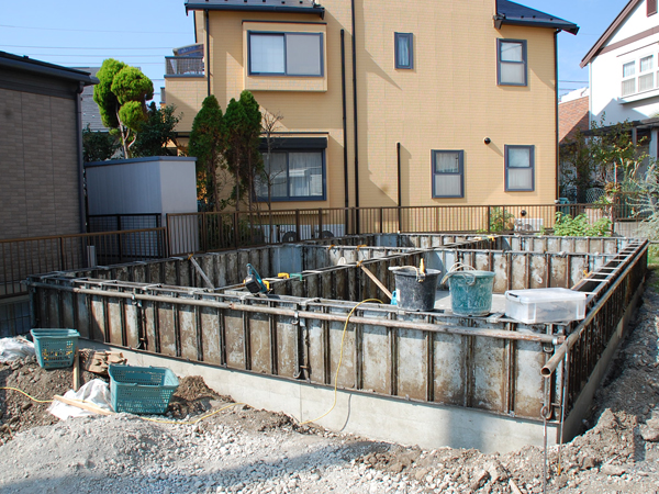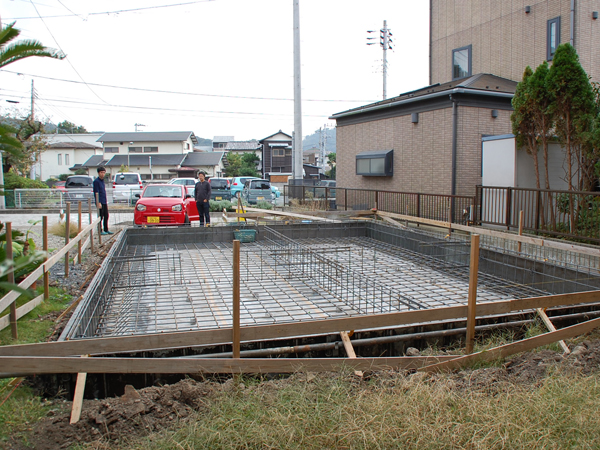 基礎の形に枠を組んで鉄筋を張り巡らせ、そこへコンクリートを流し込んで作るのですが、今日は弊社の設計士たちが事前チェックに訪れました。