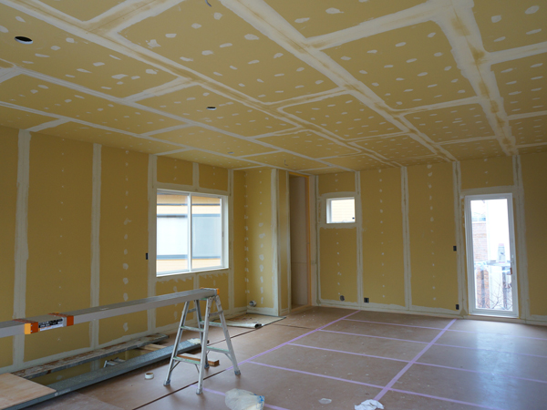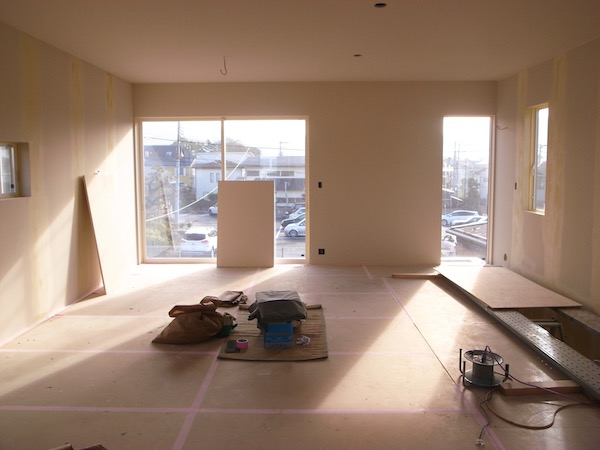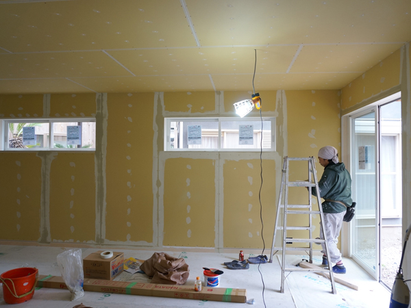 室内では下地の石膏ボードも張り終わり、塗装の前のパテ埋め作業。