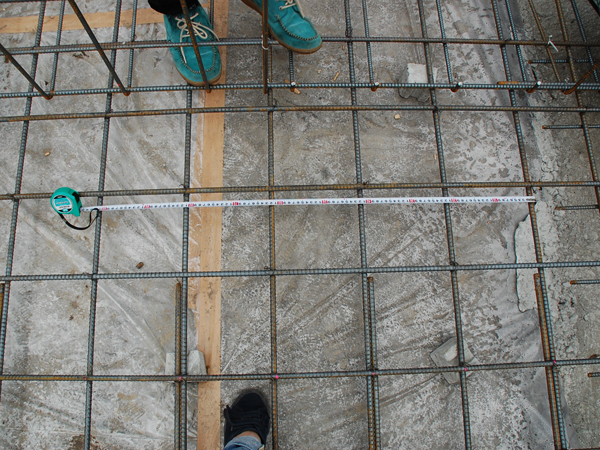 指示通りに鉄筋が均一に配置されているかを丁寧に確認。この配筋の精度によって、建物を支える基礎の強度に影響が出るので、重要な所です。