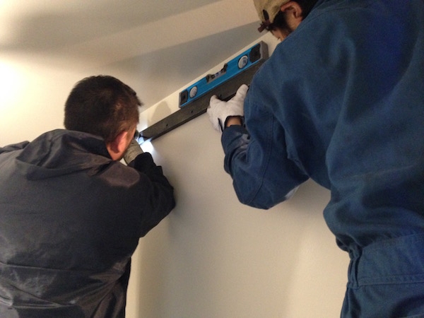 そして、ゆうに30kg以上はある鉄のドアを2人がかりで設置。もし床や周囲の壁などにぶつかると、重たくて硬い鉄製ですから、たやすく相手がえぐれてしまいます。360°に注意を払って慎重に…!