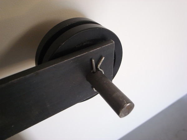 この引き戸には、上部に鉄の滑車が付いています。天井付近にレールを設置し、そこから吊り下げる形で取り付ける予定。