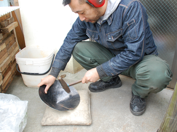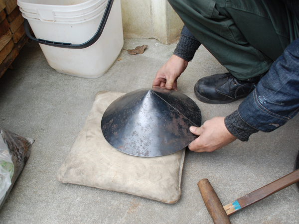 その鉄板を砂袋の上に置いて、木槌で叩きながら傘の形へと加工していきます。なんと、手作業なんですね!