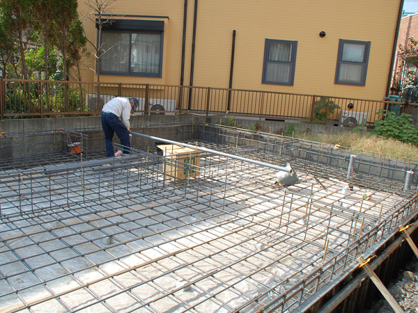 コンクリートの流し込みも2人がペアになって進めていきます。