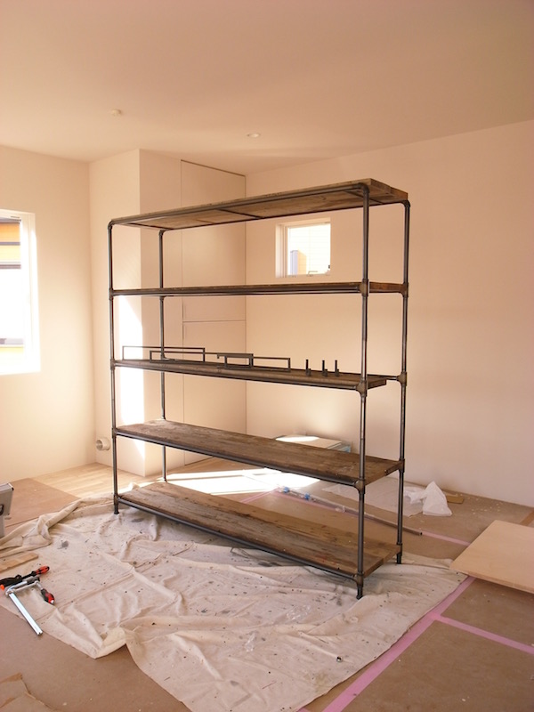こちらは、キッチンとリビング・ダイニングの仕切りとして設置する棚。鉄パイプと足場板という王道の組み合わせで制作しました。