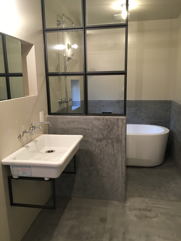 そしてこちらは1階の奥にあるバスルーム。この空間にもモールテックスを使いました。洗面所との境には、堀場氏制作のアイアンの格子窓も設置され、空間がグッと引き締まりました。海外のホテルみたいな雰囲気!