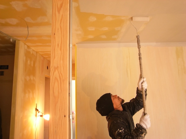 塗装した時にツルッと均一な表面に仕上げるためには、このパテ埋めの精度が大事。職人さんがボードの継ぎ目やビス部分の凹みを、一つひとつ丁寧に施工していきます。