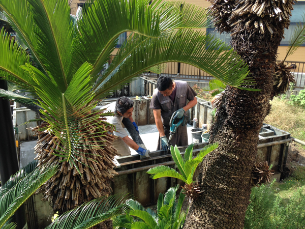 横綱級のこのソテツさんをクレーンで吊り上げての大移植。青空を飛ぶソテツさんの姿が今だに目に焼き付いております。
