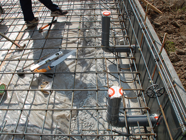 続いて、コンクリートの基礎にライフラインの管が通る穴を設けておくための作業。浄水や下水が通る管の位置に、同等の径の管をいわば仮設置します。コンクリートが固まった後にこの管を除去すれば、その部分だけ丸く穴が残るというわけ。