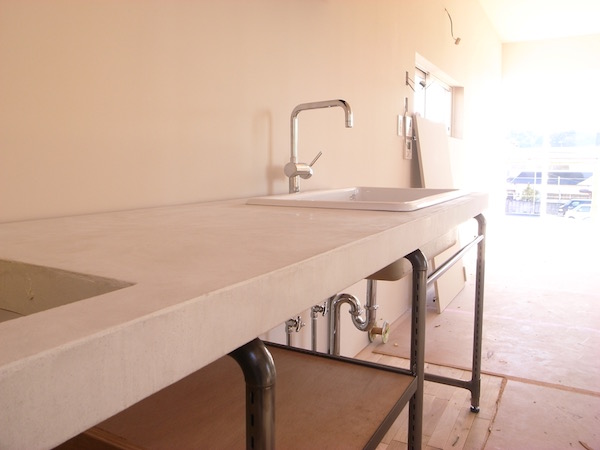 横須賀の堀場央(ほりばあきら)さんの工房で拝見したオリジナルのキッチンユニットも設置されています。見学に行った時にはまだ脚だけでしたが、天板やシンクが付いてキッチンらしくなっていました。