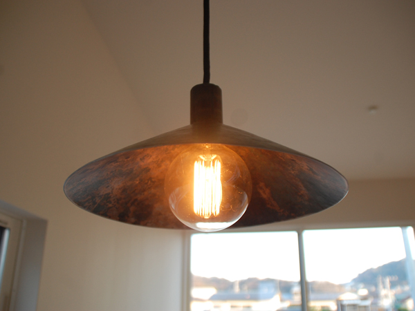 2階のダイニングスペースには、葉山のアイアン・アーティスト橋本大輔氏が木槌で鉄の板を叩いて整形したランプを設置。ランプシェード内の叩いた跡の凹凸に光が反射して、まるで銀河がそこにあるみたい。これに照らされる食卓は、否応なしに雰囲気のあるものになるでしょう。