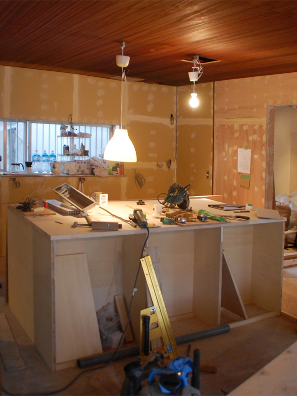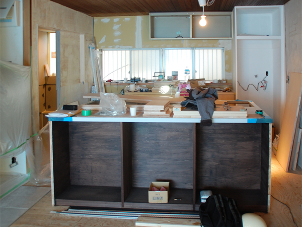 元は奥に見えている黄色い壁下地に向かってキッチン設備があったのですが、大きな開口部に向かって料理ができるアイランド型のカウンターを設置することになりました。