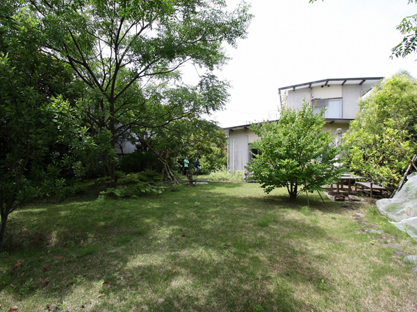 一見しただけでは表からは分からないのですが、錆びた古い門から奥へと伸びる長いアプローチを経て辿り着くのは、樹々に包まれた広い広い庭!建物部分の面積の倍以上はあろうかという贅沢なスペースです。その上に広がるのは、遮るもののない青空。