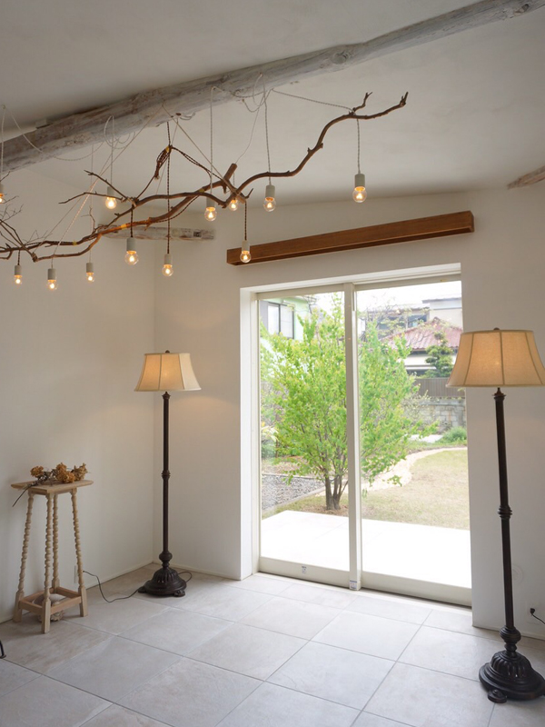 そして、天井の不思議な照明は、同じくM夫妻から譲り受けた流木に、CALLACさんが電球を纏わせる加工をして、世界に一つだけの照明へと変身させてくれました。これはもうアートの領域!