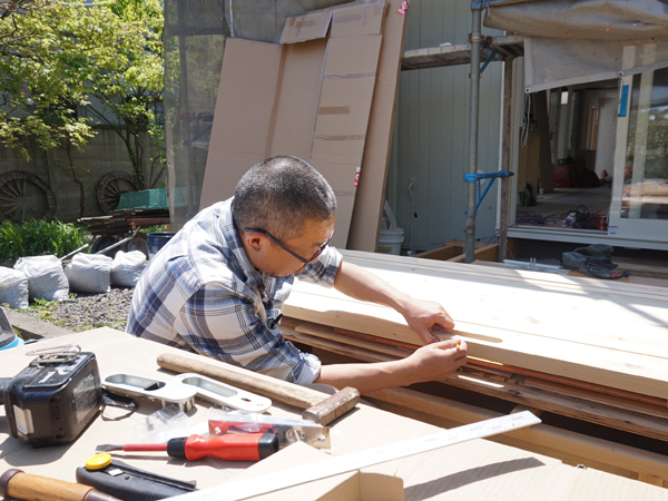 よく晴れた4月のある日、現場ではCALLACの代表 大塚さんが、青空の下で何やらこしらえていました。引き戸のように見えますが、こういうのって、建具屋さんが作るものなのでは?