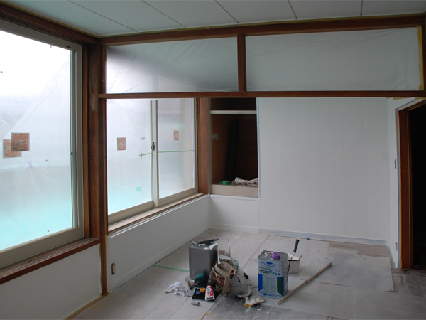 2階ではサッシが取り替えられ、早くも壁の塗装が施されました。